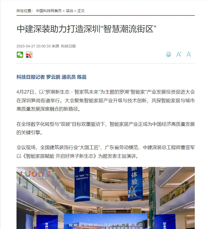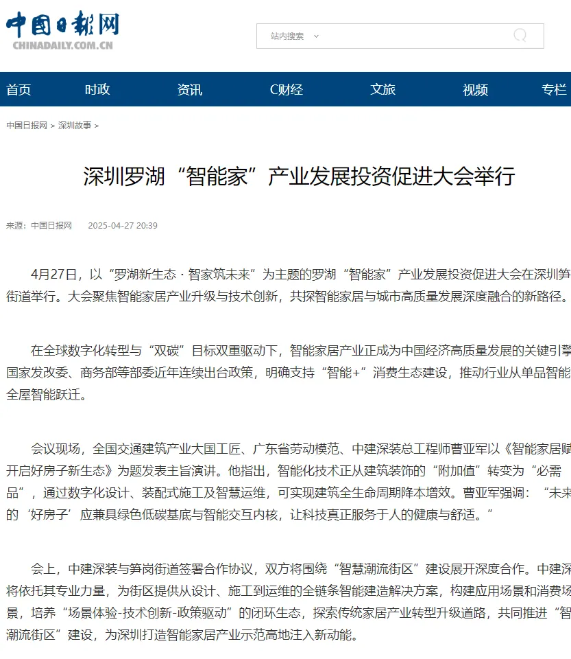 4月27日,由深圳市罗湖区人民政府指导,罗湖区投资促进局、笋岗街道办事处主办的以“罗湖新生态智家筑未来”为主题的罗湖“智能家”产业发展投资促进大会在深圳举行。中建深装党委副书记、工会主席张能训在现场签署合作协议,副总经理、总工程师曹亚军发表主旨演讲。