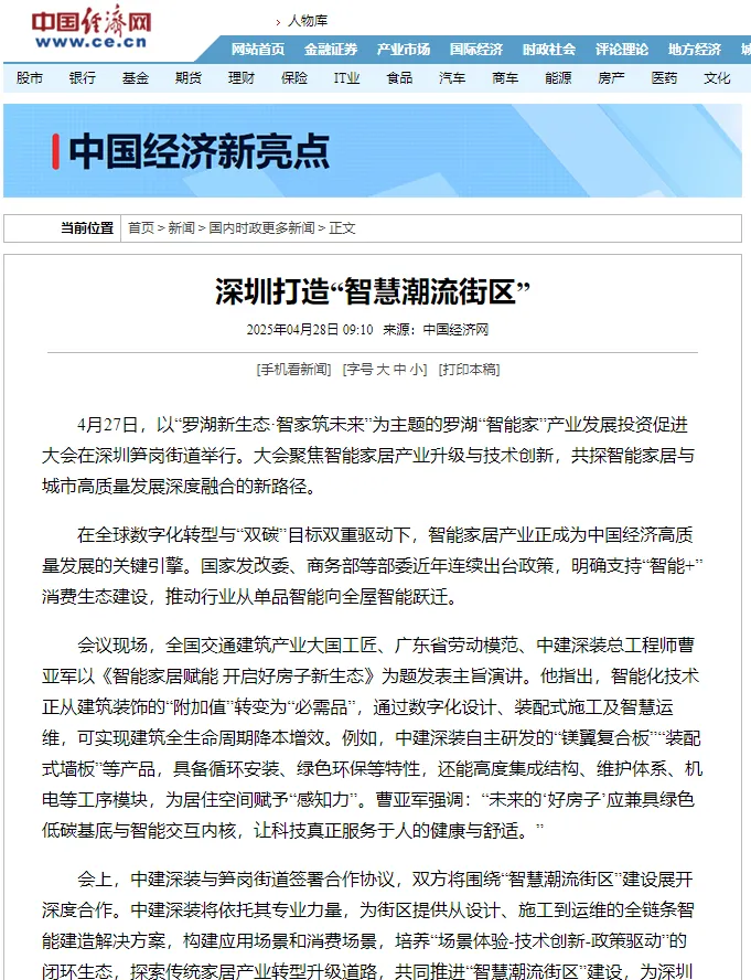会上,张能训代表中建深装与笋岗街道签署合作协议,双方将围绕“智慧潮流街区”建设展开深度合作。中建深装作为中国建筑装饰全产业链集成者,将充分发挥在模块化“好房子”智能建造上的引领优势,为当地政府提供从设计、施工到运维的全链条智能建造解决方案,构建应用场景和消费场景,培养“场景体验-技术创新-政策驱动”的闭环生态,探索传统家居产业转型升级道路,共同推进“智慧潮流街区”建设,为深圳打造智能家居产业示范地注入新动能。